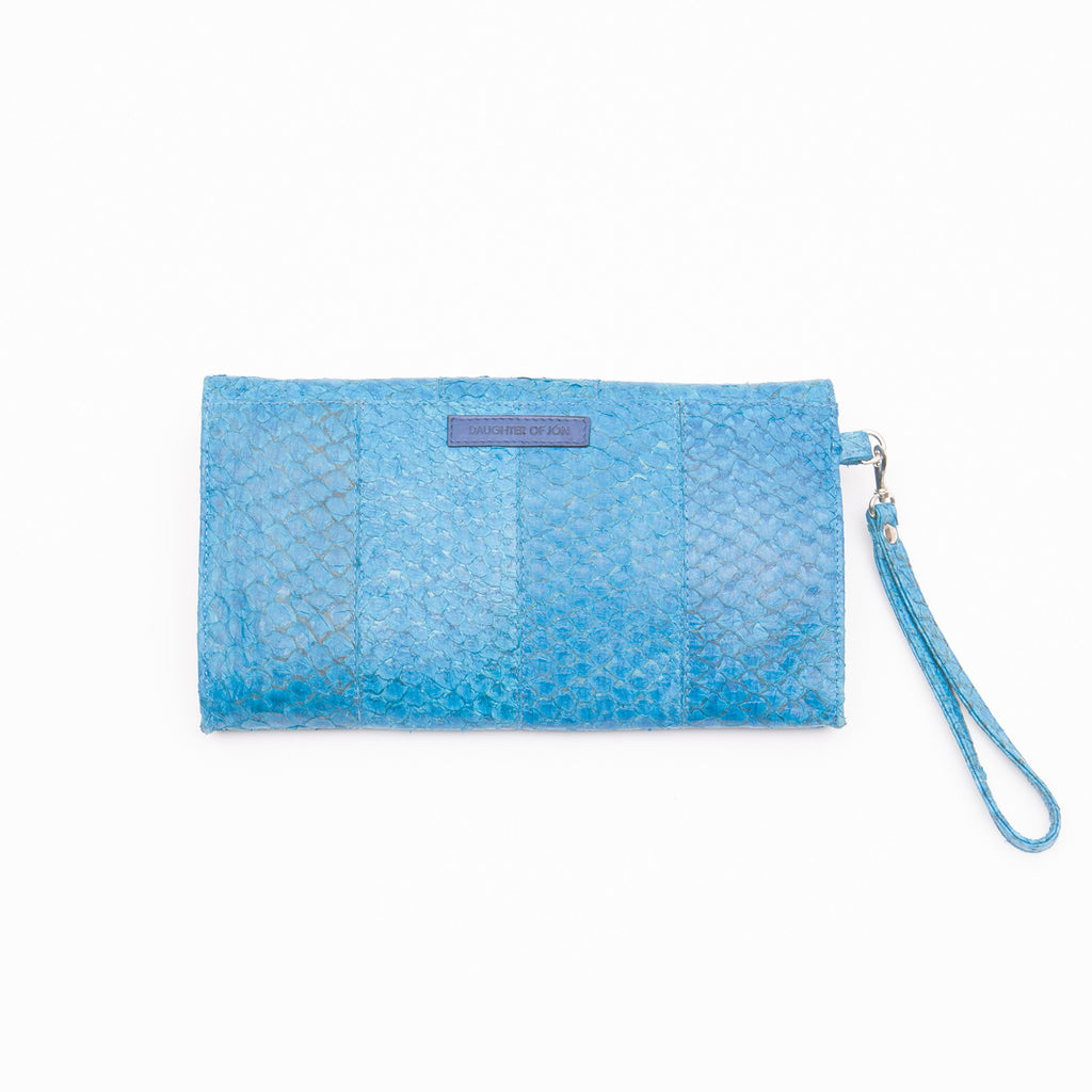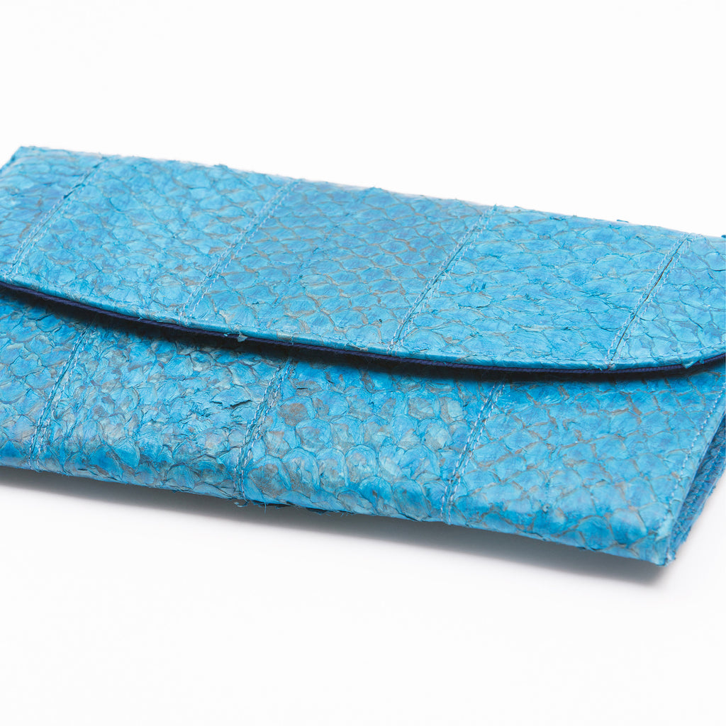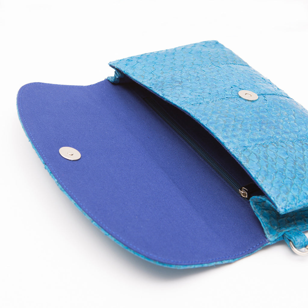 This colour variation of this season's fish leather clutches is the perfect balance of bold and classy. Deep blue fish leather creates a depth to the clutch that allows for unique outfits and unusual combinations.